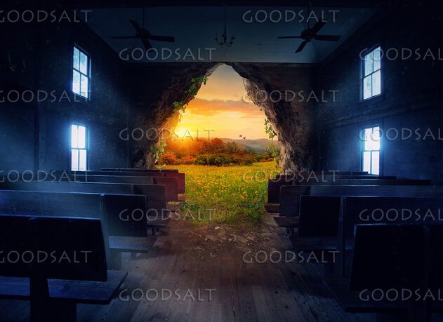 An empty church with an opening to a beautiful landscape by Kevin Carden