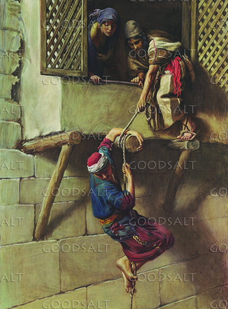Joshua 21 And Joshua the son of Nun sent two men secretly from Shittim as spies, saying, “Go, view the land, especially Jericho.” And they went and came into the house of a prostitute whose name was Rahab and lodged there.2 And it was told to the king of Jericho, “Behold, men of Israel have come here tonight to search out the land.”3 Then the king of Jericho sent to Rahab, saying, “Bring out the men who have come to you, who entered your house, for they have come to search out all the land.”4 But the woman had taken the two men and hidden them. And she said, “True, the men came to me, but I did not know where they were from.5 And when the gate was about to be closed at dark, the men went out. I do not know where the men went. Pursue them quickly, for you will overtake them.”6 But she had brought them up to the roof and hid them with the stalks of flax that she had laid in order on the roof.7 So the men pursued after them on the way to the Jordan as far as the fords. And the gate was shut as soon as the pursuers had gone out.8 Before the men lay down, she came up to them on the roof9 and said to the men, “I know that the LORD has given you the land, and that the fear of you has fallen upon us, and that all the inhabitants of the land melt away before you.10 For we have heard how the LORD dried up the water of the Red Sea before you when you came out of Egypt, and what you did to the two kings of the Amorites who were beyond the Jordan, to Sihon and Og, whom you devoted to destruction.11 And as soon as we heard it, our hearts melted, and there was no spirit left in any man because of you, for the LORD your God, he is God in the heavens above and on the earth beneath.12 Now then, please swear to me by the LORD that, as I have dealt kindly with you, you also will deal kindly with my father's house, and give me a sure sign13 that you will save alive my father and mother, my brothers and sisters, and all who belong to them, and deliver our lives from death.”14 And the men said to her, “Our life for yours even to death! If you do not tell this business of ours, then when the LORD gives us the land we will deal kindly and faithfully with you.”15 Then she let them down by a rope through the window, for her house was built into the city wall, so that she lived in the wall.16 And she said to them, “Go into the hills, or the pursuers will encounter you, and hide there three days until the pursuers have returned. Then afterward you may go your way.”17 The men said to her, “We will be guiltless with respect to this oath of yours that you have made us swear.18 Behold, when we come into the land, you shall tie this scarlet cord in the window through which you let us down, and you shall gather into your house your father and mother, your brothers, and all your father's household.19 Then if anyone goes out of the doors of your house into the street, his blood shall be on his own head, and we shall be guiltless. But if a hand is laid on anyone who is with you in the house, his blood shall be on our head.20 But if you tell this business of ours, then we shall be guiltless with respect to your oath that you have made us swear.”21 And she said, “According to your words, so be it.” Then she sent them away, and they departed. And she tied the scarlet cord in the window.22 They departed and went into the hills and remained there three days until the pursuers returned, and the pursuers searched all along the way and found nothing.23 Then the two men returned. They came down from the hills and passed over and came to Joshua the son of Nun, and they told him all that had happened to them.24 And they said to Joshua, “Truly the LORD has given all the land into our hands. And also, all the inhabitants of the land melt away because of us.” | |