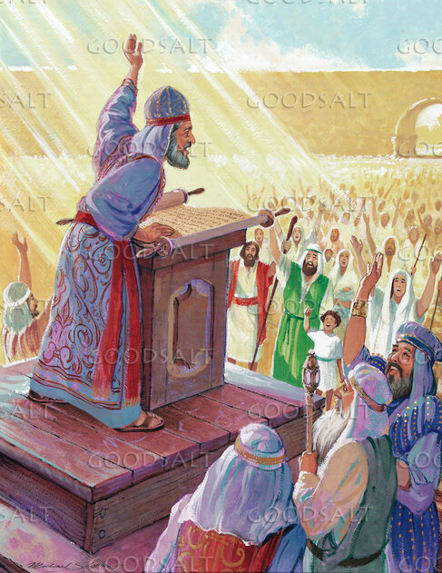 Nehemiah 81 And all the people gathered as one man into the square before the Water Gate. And they told Ezra the scribe to bring the Book of the Law of Moses that the LORD had commanded Israel.2 So Ezra the priest brought the Law before the assembly, both men and women and all who could understand what they heard, on the first day of the seventh month.3 And he read from it facing the square before the Water Gate from early morning until midday, in the presence of the men and the women and those who could understand. And the ears of all the people were attentive to the Book of the Law.4 And Ezra the scribe stood on a wooden platform that they had made for the purpose. And beside him stood Mattithiah, Shema, Anaiah, Uriah, Hilkiah, and Maaseiah on his right hand, and Pedaiah, Mishael, Malchijah, Hashum, Hashbaddanah, Zechariah, and Meshullam on his left hand.5 And Ezra opened the book in the sight of all the people, for he was above all the people, and as he opened it all the people stood.6 And Ezra blessed the LORD, the great God, and all the people answered, “Amen, Amen,” lifting up their hands. And they bowed their heads and worshiped the LORD with their faces to the ground.7 Also Jeshua, Bani, Sherebiah, Jamin, Akkub, Shabbethai, Hodiah, Maaseiah, Kelita, Azariah, Jozabad, Hanan, Pelaiah, the Levites, helped the people to understand the Law, while the people remained in their places.8 They read from the book, from the Law of God, clearly, and they gave the sense, so that the people understood the reading.9 And Nehemiah, who was the governor, and Ezra the priest and scribe, and the Levites who taught the people said to all the people, “This day is holy to the LORD your God; do not mourn or weep.” For all the people wept as they heard the words of the Law.10 Then he said to them, “Go your way. Eat the fat and drink sweet wine and send portions to anyone who has nothing ready, for this day is holy to our Lord. And do not be grieved, for the joy of the LORD is your strength.”11 So the Levites calmed all the people, saying, “Be quiet, for this day is holy; do not be grieved.”12 And all the people went their way to eat and drink and to send portions and to make great rejoicing, because they had understood the words that were declared to them.13 On the second day the heads of fathers' houses of all the people, with the priests and the Levites, came together to Ezra the scribe in order to study the words of the Law.14 And they found it written in the Law that the LORD had commanded by Moses that the people of Israel should dwell in booths during the feast of the seventh month,15 and that they should proclaim it and publish it in all their towns and in Jerusalem, “Go out to the hills and bring branches of olive, wild olive, myrtle, palm, and other leafy trees to make booths, as it is written.”16 So the people went out and brought them and made booths for themselves, each on his roof, and in their courts and in the courts of the house of God, and in the square at the Water Gate and in the square at the Gate of Ephraim.17 And all the assembly of those who had returned from the captivity made booths and lived in the booths, for from the days of Jeshua the son of Nun to that day the people of Israel had not done so. And there was very great rejoicing.18 And day by day, from the first day to the last day, he read from the Book of the Law of God. They kept the feast seven days, and on the eighth day there was a solemn assembly, according to the rule. | |