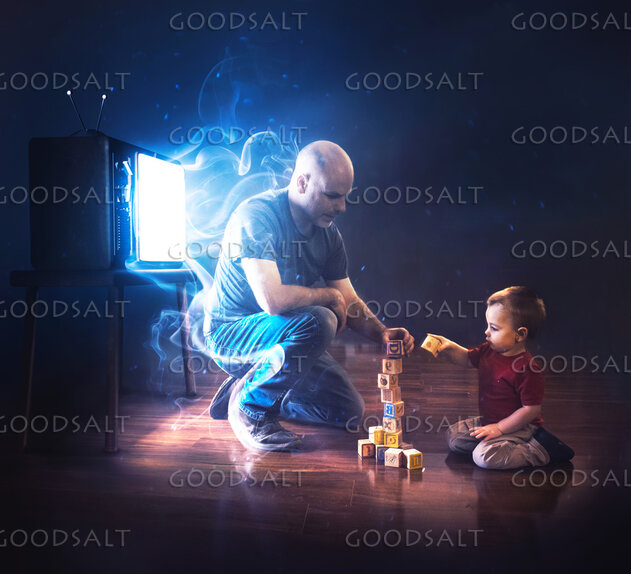 A father stands in front of the TV so he can play with his son. by Kevin Carden