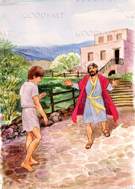 Luke 1511 And he said, “There was a man who had two sons.12 And the younger of them said to his father, ‘Father, give me the share of property that is coming to me.’ And he divided his property between them.13 Not many days later, the younger son gathered all he had and took a journey into a far country, and there he squandered his property in reckless living.14 And when he had spent everything, a severe famine arose in that country, and he began to be in need.15 So he went and hired himself out to one of the citizens of that country, who sent him into his fields to feed pigs.16 And he was longing to be fed with the pods that the pigs ate, and no one gave him anything.17 “But when he came to himself, he said, ‘How many of my father's hired servants have more than enough bread, but I perish here with hunger!18 I will arise and go to my father, and I will say to him, “Father, I have sinned against heaven and before you.19 I am no longer worthy to be called your son. Treat me as one of your hired servants.”’20 And he arose and came to his father. But while he was still a long way off, his father saw him and felt compassion, and ran and embraced him and kissed him.21 And the son said to him, ‘Father, I have sinned against heaven and before you. I am no longer worthy to be called your son.’22 But the father said to his servants, ‘Bring quickly the best robe, and put it on him, and put a ring on his hand, and shoes on his feet.23 And bring the fattened calf and kill it, and let us eat and celebrate.24 For this my son was dead, and is alive again; he was lost, and is found.’ And they began to celebrate.25 “Now his older son was in the field, and as he came and drew near to the house, he heard music and dancing.26 And he called one of the servants and asked what these things meant.27 And he said to him, ‘Your brother has come, and your father has killed the fattened calf, because he has received him back safe and sound.’28 But he was angry and refused to go in. His father came out and entreated him,29 but he answered his father, ‘Look, these many years I have served you, and I never disobeyed your command, yet you never gave me a young goat, that I might celebrate with my friends.30 But when this son of yours came, who has devoured your property with prostitutes, you killed the fattened calf for him!’31 And he said to him, ‘Son, you are always with me, and all that is mine is yours.32 It was fitting to celebrate and be glad, for this your brother was dead, and is alive; he was lost, and is found.’” | |