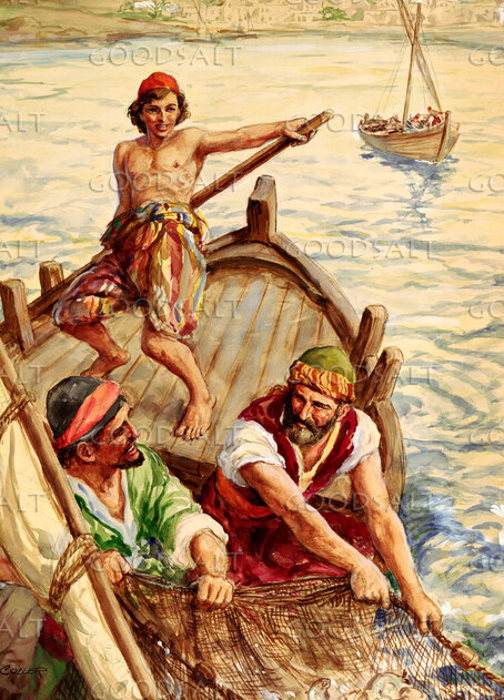 Luke 51 On one occasion, while the crowd was pressing in on him to hear the word of God, he was standing by the lake of Gennesaret,2 and he saw two boats by the lake, but the fishermen had gone out of them and were washing their nets.3 Getting into one of the boats, which was Simon's, he asked him to put out a little from the land. And he sat down and taught the people from the boat.4 And when he had finished speaking, he said to Simon, “Put out into the deep and let down your nets for a catch.”5 And Simon answered, “Master, we toiled all night and took nothing! But at your word I will let down the nets.”6 And when they had done this, they enclosed a large number of fish, and their nets were breaking.7 They signaled to their partners in the other boat to come and help them. And they came and filled both the boats, so that they began to sink.8 But when Simon Peter saw it, he fell down at Jesus' knees, saying, “Depart from me, for I am a sinful man, O Lord.”9 For he and all who were with him were astonished at the catch of fish that they had taken,10 and so also were James and John, sons of Zebedee, who were partners with Simon. And Jesus said to Simon, “Do not be afraid; from now on you will be catching men.”11 And when they had brought their boats to land, they left everything and followed him. | |