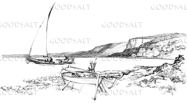 Black and white line drawing of first century fishermen and their fishing boats. Shoreline and town. by Review & Herald Publishing