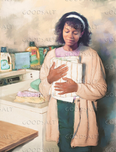 A woman holding clothes after being in the dryer. by Lars Justinen
