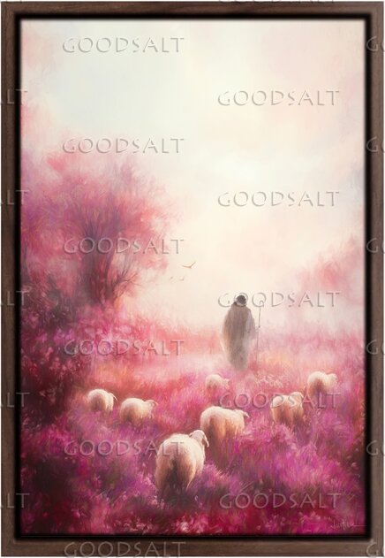 Painted by American artist, Lars Justinen, the artwork portrays Christ as the Good Shepherd, leading His flock through a breathtaking field of blossoming heather bathed in warm, ethereal light. The robed figure, staff in hand, walks toward a luminous horizon, symbolizing Jesus as the guide and protector of His people as described in John 10. The sheep gathered at His feet represent the faithful who hear His voice and follow. The soft, glowing mist surrounding the scene evokes the presence of the Divine, while the blossoming pink and crimson flowers speak to the beauty and abundance found in His care. Birds in flight above echo the theme of freedom and peace found in His flock.