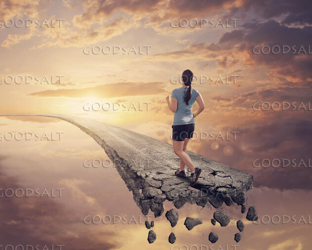 The road is breaking behind the woman, so she presses on to the future and forgets the past. by Kevin Carden