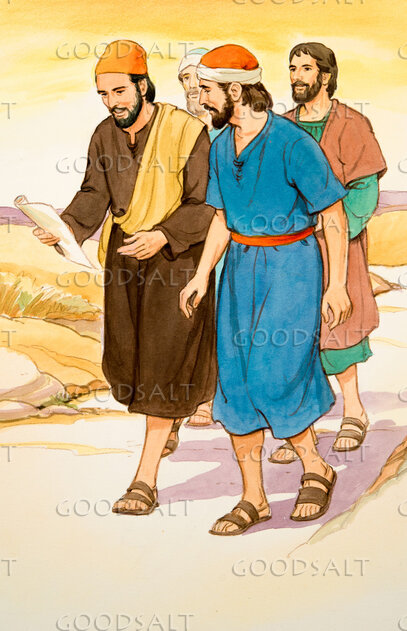 Four friends study a letter on their way somewhere. by Lifeway Collection