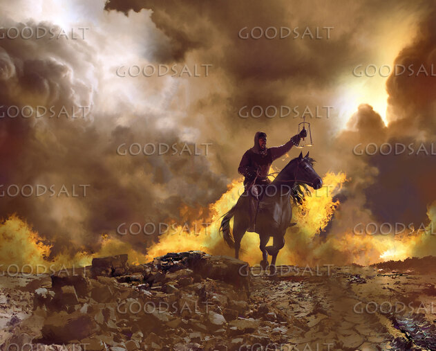 1 Now I watched when the Lamb opened one of the seven seals, and I heard one of the four living creatures say with a voice like thunder, “Come!”2 And I looked, and behold, a white horse! And its rider had a bow, and a crown was given to him, and he came out conquering, and to conquer.3 When he opened the second seal, I heard the second living creature say, “Come!”4 And out came another horse, bright red. Its rider was permitted to take peace from the earth, so that people should slay one another, and he was given a great sword.5 When he opened the third seal, I heard the third living creature say, “Come!” And I looked, and behold, a black horse! And its rider had a pair of scales in his hand.6 And I heard what seemed to be a voice in the midst of the four living creatures, saying, “A quart of wheat for a denarius, and three quarts of barley for a denarius, and do not harm the oil and wine!”7 When he opened the fourth seal, I heard the voice of the fourth living creature say, “Come!”8 And I looked, and behold, a pale horse! And its rider's name was Death, and Hades followed him. And they were given authority over a fourth of the earth, to kill with sword and with famine and with pestilence and by wild beasts of the earth.