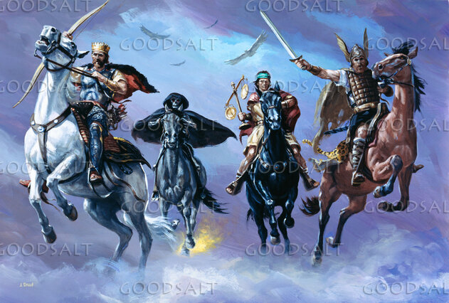 2 And I looked, and behold, a white horse! And its rider had a bow, and a crown was given to him, and he came out conquering, and to conquer.3 When he opened the second seal, I heard the second living creature say, “Come!”4 And out came another horse, bright red. Its rider was permitted to take peace from the earth, so that people should slay one another, and he was given a great sword.5 When he opened the third seal, I heard the third living creature say, “Come!” And I looked, and behold, a black horse! And its rider had a pair of scales in his hand.6 And I heard what seemed to be a voice in the midst of the four living creatures, saying, “A quart of wheat for a denarius, and three quarts of barley for a denarius, and do not harm the oil and wine!”7 When he opened the fourth seal, I heard the voice of the fourth living creature say, “Come!”8 And I looked, and behold, a pale horse! And its rider's name was Death, and Hades followed him. And they were given authority over a fourth of the earth, to kill with sword and with famine and with pestilence and by wild beasts of the earth.