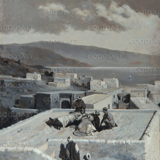 Some friends lower a man with palsy down through a hole in a roof to be healed by Jesus by Review & Herald Publishing