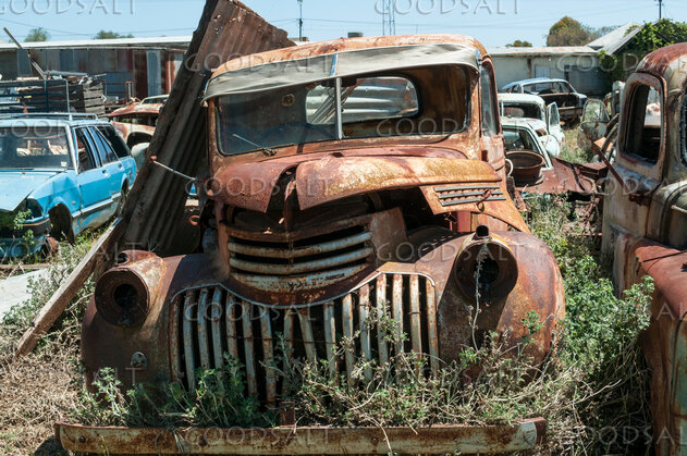 Front of rusty Chevrolet truck in wrecking yard. by Mal Austin