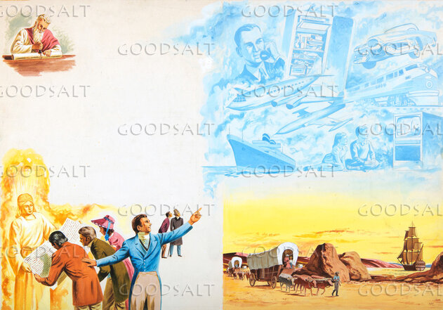 Four illustrated panels of the spirit of progress. Prophet Daniel seals the scroll, historical people and an opened scroll, covered wagons in the new America, and modern marvels of the early 20th century. Men shall run to and fro and knowledge shall be increased. The end of days prior to Christ's second coming.