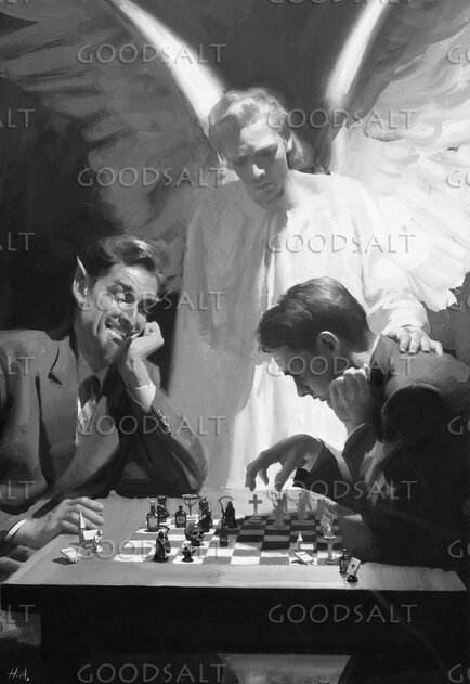 Devil playing young man in chess with guardian angel looking on. Black and white. Harry Anderson painting. by Review & Herald Publishing