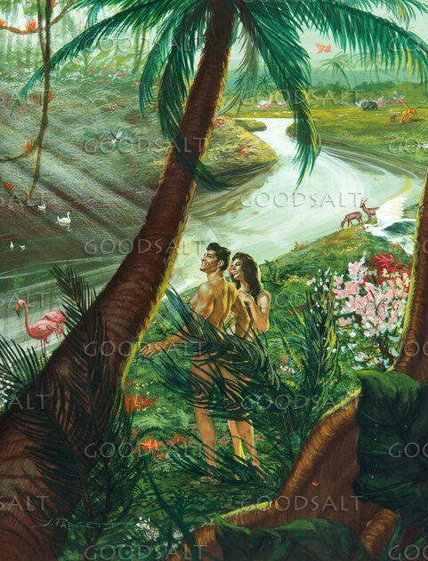 Adam and Eve Enjoy Nature in the Garden of Eden. They are smiling and happy. Lots of greenery, flowers, deers drinking from river. Flamingos. Adam and Eve are standing and looking upward. by Review & Herald Publishing