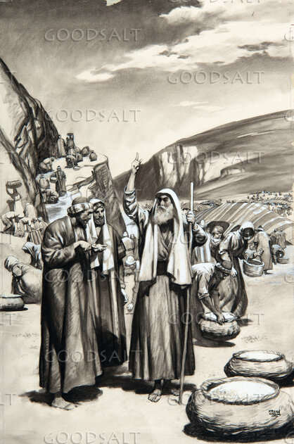 Moses is giving instructions as to the gathering of manna. He is pointing to the sky, possibly telling them by the setting of the sun,they must gather enough for two days so they will have manna for the Sabbath. Black and white picture.