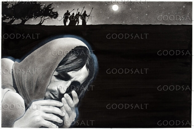 Christ praying in Gethsemane and soldiers come to capture Him. by Review & Herald Publishing