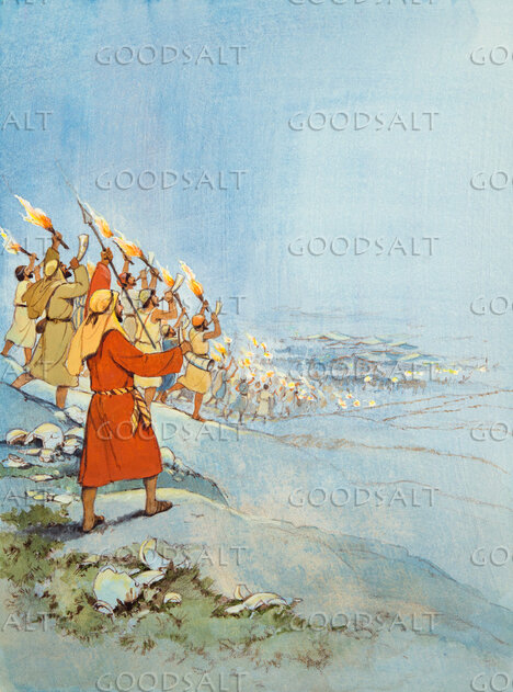 16 And he divided the 300 men into three companies and put trumpets into the hands of all of them and empty jars, with torches inside the jars.17 And he said to them, “Look at me, and do likewise. When I come to the outskirts of the camp, do as I do.18 When I blow the trumpet, I and all who are with me, then blow the trumpets also on every side of all the camp and shout, ‘For the LORD and for Gideon.’”19 So Gideon and the hundred men who were with him came to the outskirts of the camp at the beginning of the middle watch, when they had just set the watch. And they blew the trumpets and smashed the jars that were in their hands.20 Then the three companies blew the trumpets and broke the jars. They held in their left hands the torches, and in their right hands the trumpets to blow. And they cried out, “A sword for the LORD and for Gideon!”