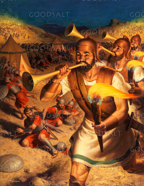 Gideon's soldiers attack the Midianite Camp, blowing trumpets and carrying torches. The remaining 300 soldiers of Gideon are running down nearby hillls toward the Midianite camps. Close up of Gideon's soldiers.