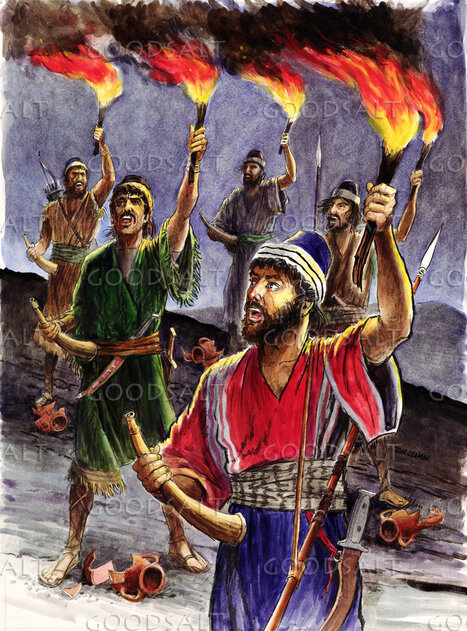 Judges 71 Then Jerubbaal (that is, Gideon) and all the people who were with him rose early and encamped beside the spring of Harod. And the camp of Midian was north of them, by the hill of Moreh, in the valley.2 The LORD said to Gideon, “The people with you are too many for me to give the Midianites into their hand, lest Israel boast over me, saying, ‘My own hand has saved me.’3 Now therefore proclaim in the ears of the people, saying, ‘Whoever is fearful and trembling, let him return home and hurry away from Mount Gilead.’” Then 22,000 of the people returned, and 10,000 remained.4 And the LORD said to Gideon, “The people are still too many. Take them down to the water, and I will test them for you there, and anyone of whom I say to you, ‘This one shall go with you,’ shall go with you, and anyone of whom I say to you, ‘This one shall not go with you,’ shall not go.”5 So he brought the people down to the water. And the LORD said to Gideon, “Every one who laps the water with his tongue, as a dog laps, you shall set by himself. Likewise, every one who kneels down to drink.”6 And the number of those who lapped, putting their hands to their mouths, was 300 men, but all the rest of the people knelt down to drink water.7 And the LORD said to Gideon, “With the 300 men who lapped I will save you and give the Midianites into your hand, and let all the others go every man to his home.”8 So the people took provisions in their hands, and their trumpets. And he sent all the rest of Israel every man to his tent, but retained the 300 men. And the camp of Midian was below him in the valley.9 That same night the LORD said to him, “Arise, go down against the camp, for I have given it into your hand.10 But if you are afraid to go down, go down to the camp with Purah your servant.11 And you shall hear what they say, and afterward your hands shall be strengthened to go down against the camp.” Then he went down with Purah his servant to the outposts of the armed men who were in the camp.12 And the Midianites and the Amalekites and all the people of the East lay along the valley like locusts in abundance, and their camels were without number, as the sand that is on the seashore in abundance.13 When Gideon came, behold, a man was telling a dream to his comrade. And he said, “Behold, I dreamed a dream, and behold, a cake of barley bread tumbled into the camp of Midian and came to the tent and struck it so that it fell and turned it upside down, so that the tent lay flat.”14 And his comrade answered, “This is no other than the sword of Gideon the son of Joash, a man of Israel; God has given into his hand Midian and all the camp.”15 As soon as Gideon heard the telling of the dream and its interpretation, he worshiped. And he returned to the camp of Israel and said, “Arise, for the LORD has given the host of Midian into your hand.”16 And he divided the 300 men into three companies and put trumpets into the hands of all of them and empty jars, with torches inside the jars.17 And he said to them, “Look at me, and do likewise. When I come to the outskirts of the camp, do as I do.18 When I blow the trumpet, I and all who are with me, then blow the trumpets also on every side of all the camp and shout, ‘For the LORD and for Gideon.’”19 So Gideon and the hundred men who were with him came to the outskirts of the camp at the beginning of the middle watch, when they had just set the watch. And they blew the trumpets and smashed the jars that were in their hands.20 Then the three companies blew the trumpets and broke the jars. They held in their left hands the torches, and in their right hands the trumpets to blow. And they cried out, “A sword for the LORD and for Gideon!”21 Every man stood in his place around the camp, and all the army ran. They cried out and fled.22 When they blew the 300 trumpets, the LORD set every man's sword against his comrade and against all the army. And the army fled as far as Beth-shittah toward Zererah, as far as the border of Abel-meholah, by Tabbath.23 And the men of Israel were called out from Naphtali and from Asher and from all Manasseh, and they pursued after Midian.24 Gideon sent messengers throughout all the hill country of Ephraim, saying, “Come down against the Midianites and capture the waters against them, as far as Beth-barah, and also the Jordan.” So all the men of Ephraim were called out, and they captured the waters as far as Beth-barah, and also the Jordan.25 And they captured the two princes of Midian, Oreb and Zeeb. They killed Oreb at the rock of Oreb, and Zeeb they killed at the winepress of Zeeb. Then they pursued Midian, and they brought the heads of Oreb and Zeeb to Gideon across the Jordan. Judges 81 Then the men of Ephraim said to him, “What is this that you have done to us, not to call us when you went to fight against Midian?” And they accused him fiercely.2 And he said to them, “What have I done now in comparison with you? Is not the gleaning of the grapes of Ephraim better than the grape harvest of Abiezer?3 God has given into your hands the princes of Midian, Oreb and Zeeb. What have I been able to do in comparison with you?” Then their anger against him subsided when he said this.4 And Gideon came to the Jordan and crossed over, he and the 300 men who were with him, exhausted yet pursuing.5 So he said to the men of Succoth, “Please give loaves of bread to the people who follow me, for they are exhausted, and I am pursuing after Zebah and Zalmunna, the kings of Midian.”6 And the officials of Succoth said, “Are the hands of Zebah and Zalmunna already in your hand, that we should give bread to your army?”7 So Gideon said, “Well then, when the LORD has given Zebah and Zalmunna into my hand, I will flail your flesh with the thorns of the wilderness and with briers.”8 And from there he went up to Penuel, and spoke to them in the same way, and the men of Penuel answered him as the men of S