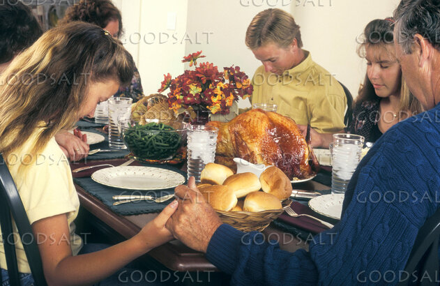 Family joins hands while giving thanks at dinner by Sally Weimer