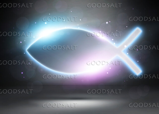 A bright glowing Jesus fish symbol with purple and blue colors by Kevin Carden