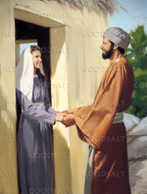 Joseph is going to take Mary to his home. Standing at Mary's door. by Lifeway Collection