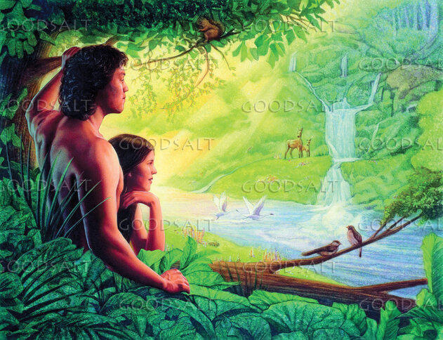 Adam and Eve are seen in the Garden of Eden enjoying the beauty of the world around them. by Lifeway Collection