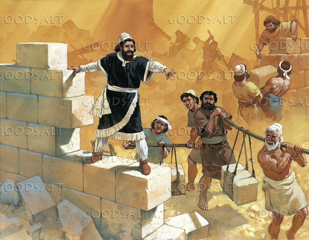 Nehemiah is overseeing several men who are carrying large blocks of stone that are being used to build a building. Nehemiah is standing on some of the blocks and appears to be telling the men where to take the stones. by Lifeway Collection