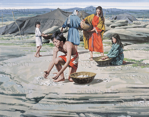 The Israelites are gathering manna (bread) that the Lord provided for them for six days a week on their 40-year journey to Canaan. by Lifeway Collection