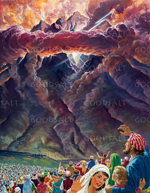 God gives Moses the law at Mt. Sinai with the children of Israel watching. On the morning of the third day, Mt Sinai became like a volcano. The summit is wrapped in a fiery cloud. Mt Sinai is covered with smoke because the Lord is descending on it in fire. The children of Israel are at the bottom shaking with fear. When the Lord finished speaking to Moses on Mt. Sinai, He gave him the two tablets of the Testimony, the tablets of stone inscribed by the finger of God.