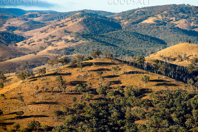Elevated view of steep rolling farm land with scattered trees in the morning light. by Mal Austin
