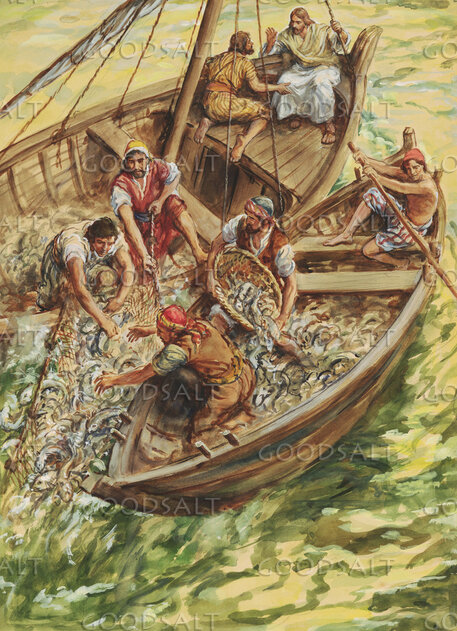 Luke 51 On one occasion, while the crowd was pressing in on him to hear the word of God, he was standing by the lake of Gennesaret,2 and he saw two boats by the lake, but the fishermen had gone out of them and were washing their nets.3 Getting into one of the boats, which was Simon's, he asked him to put out a little from the land. And he sat down and taught the people from the boat.4 And when he had finished speaking, he said to Simon, “Put out into the deep and let down your nets for a catch.”5 And Simon answered, “Master, we toiled all night and took nothing! But at your word I will let down the nets.”6 And when they had done this, they enclosed a large number of fish, and their nets were breaking.7 They signaled to their partners in the other boat to come and help them. And they came and filled both the boats, so that they began to sink.8 But when Simon Peter saw it, he fell down at Jesus' knees, saying, “Depart from me, for I am a sinful man, O Lord.”9 For he and all who were with him were astonished at the catch of fish that they had taken,10 and so also were James and John, sons of Zebedee, who were partners with Simon. And Jesus said to Simon, “Do not be afraid; from now on you will be catching men.”11 And when they had brought their boats to land, they left everything and followed him. | |
