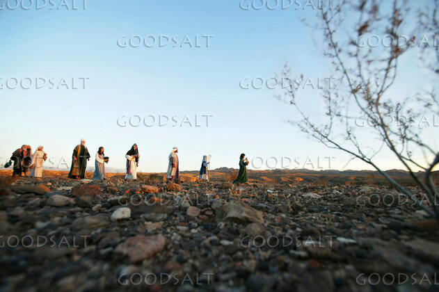 A group of Isrealites walking through the a rocky desert. Bush on right side by Erik Stenbakken