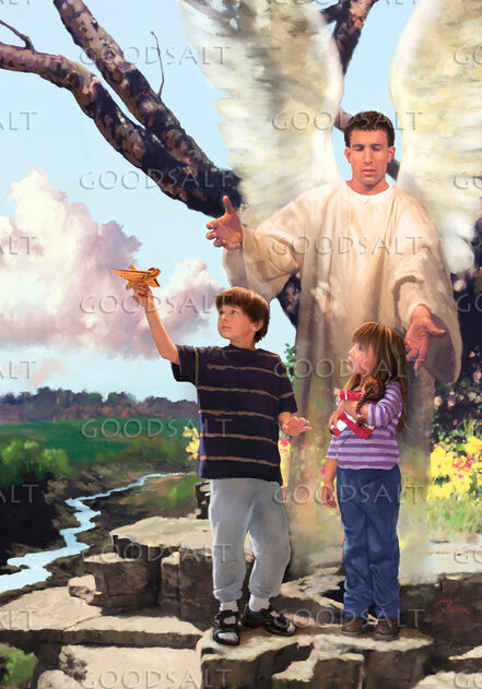 An angel protects children as they play near cliff by Lars Justinen