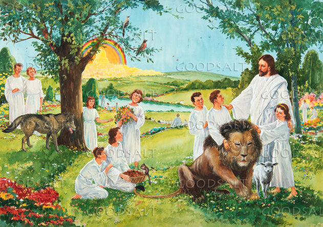 Jesus and the redeemed in the New Earth paradise with the New Jerusalem city in the distance. Children pet lion and lamb. Treem flowers, squirrel, birds, wolf.