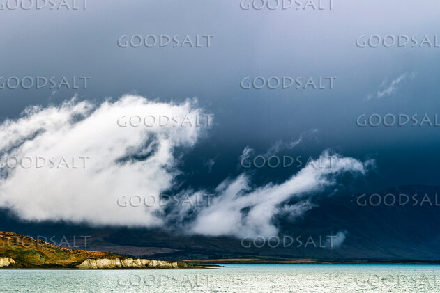 Heavy dark sky behind yellow clay cliffs on single point with wispy white cloud like a yacht's sail. by Mal Austin