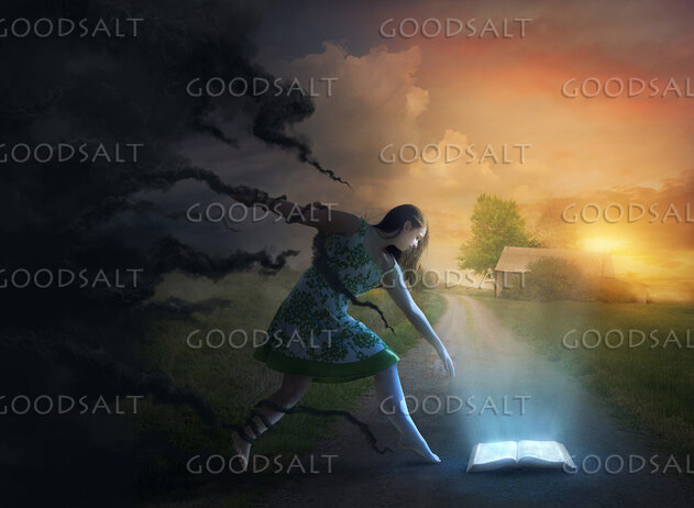 A woman is held back by the darkness while reaching for a glowing Bible. by Kevin Carden