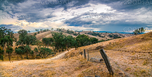 Farm fence, dirt road and dramatic skies. by Mal Austin
