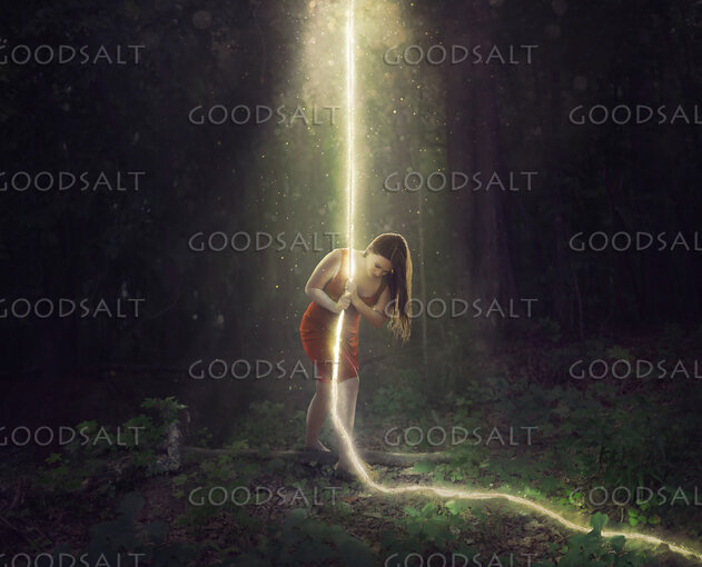 A woman in the forest pulls a glowing light rope from the trees. by Kevin Carden