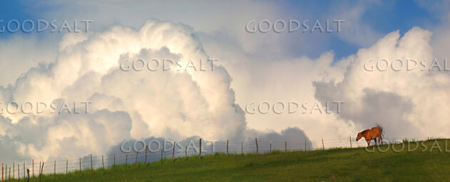 Dramatic landscape with billowing clouds and a single horse. by John Clement