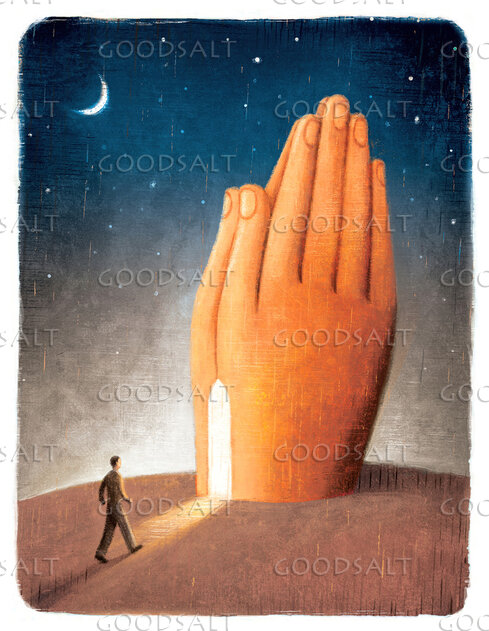 A cartoon illustration of a man walking under a moon-lit, starry landscape into a giant pair of praying hands lit from inside. by Krieg Barrie