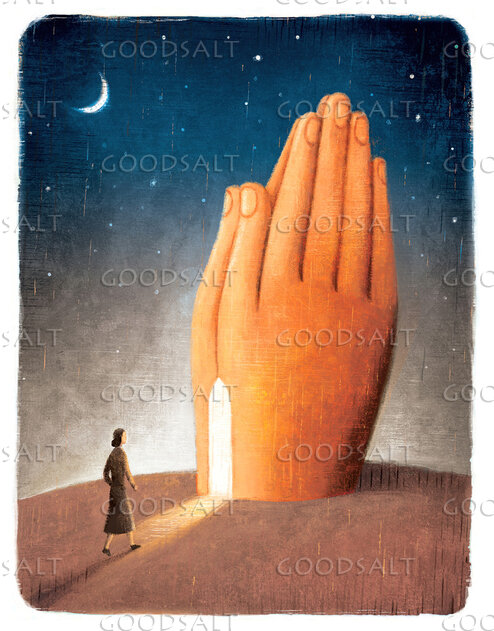 A cartoon illustration of a woman walking under a moon-lit, starry landscape into a giant pair of praying hands lit from inside. by Krieg Barrie