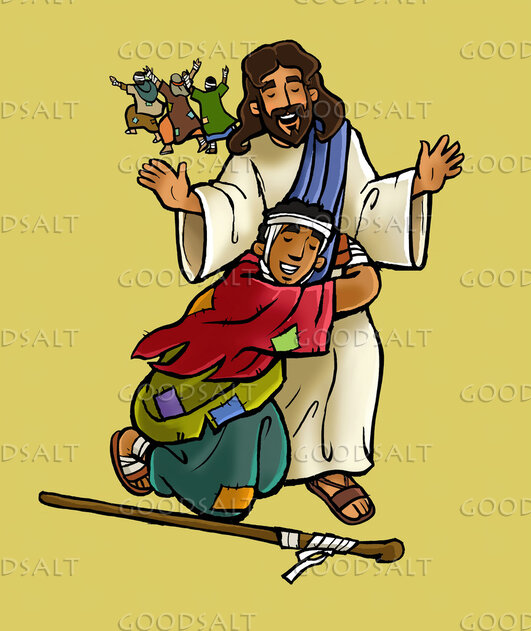 Jesus heals a Samaritan leper who comes back and thanks him, while the other nine who were healed hurry away without giving thanks first. Heavy line style. Children's division.