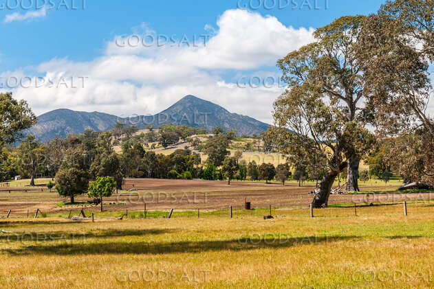 huge redgum trees in field with rocky mountains at rear