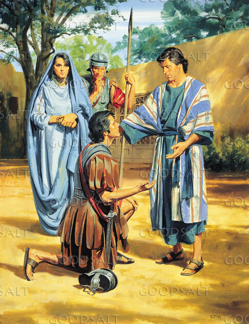 Peter sharing his faith cross-culturally with the Gentiles, Cornelius is kneeling before Peter, but Peter is telling Cornelius to stand up because he is just another man.