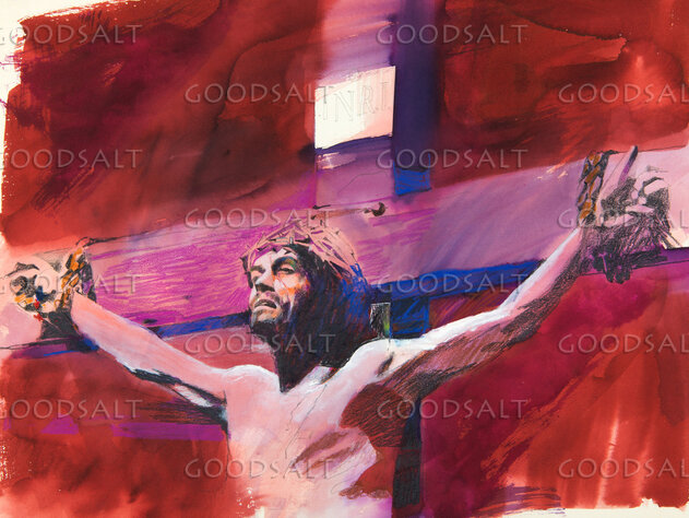 The crucifixion of Jesus Christ, close up of upper body and stretched out arms, the sign nailed above Jesus head. Mixed media. by Review & Herald Publishing