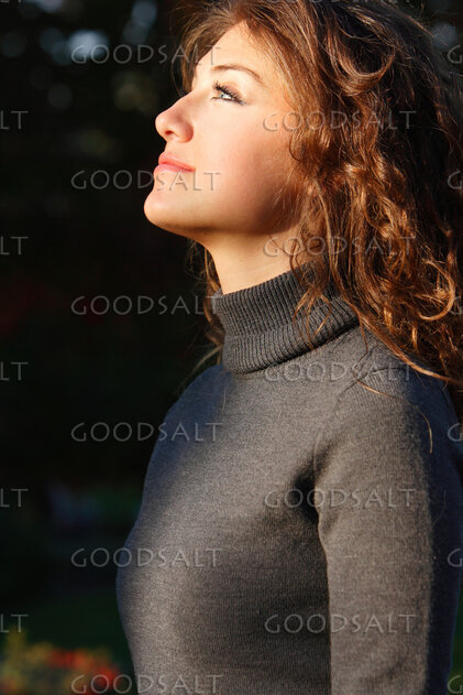IDAHO. Boise. Young woman looking up into light (close-up).