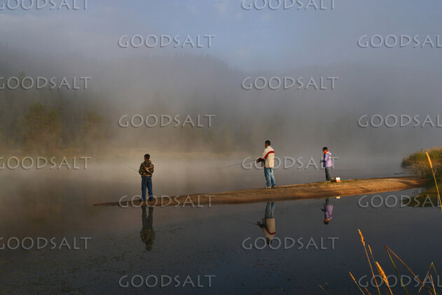 2. IDAHO. Smith’s Ferry. Man and kids fishing on foggy morning.