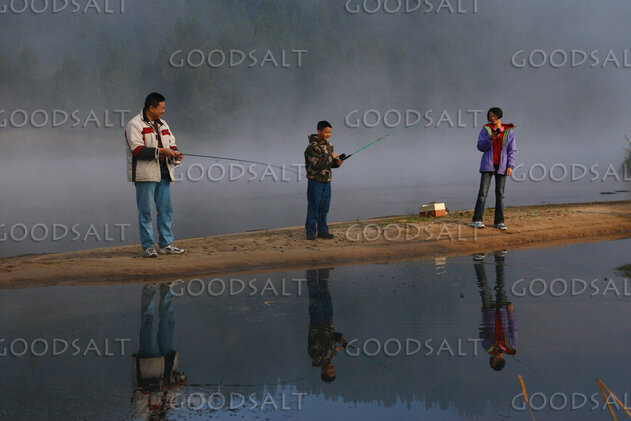 2. IDAHO. Smith’s Ferry. Man and kids fishing on foggy morning.