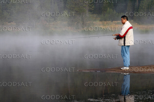 7. IDAHO. Smith’s Ferry. Boy fishing on foggy morning. MR